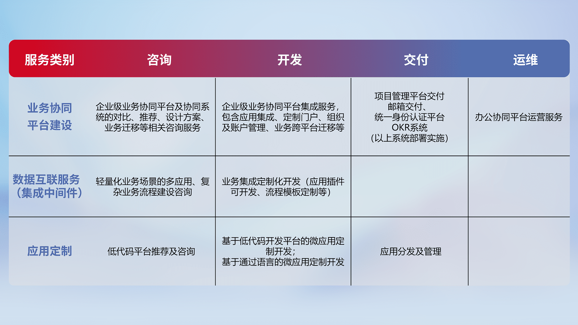针对钉钉、、企微、、、IDaas等平台级产品提供产品的规划、、、、方案、、交付、、定制化开发等服务,,实现如统一协同办公、、智能客户服务、、混合会议管理、、、、智能数据查询、、、、等业务场景,,,实现数字化转型。。。。